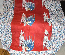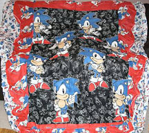 One of two known Comforter/Padded Blankets sold in the USA. These are big, and can cover a single or double bed. Filled with fibers for extra warmth. This one features big color stock-art sonics and a nice assortment of chalk-line style stock arts. It is reversable with the red side underneath. You can find these occaisonally on Ebay Auctions... BUT expect to pay OVER $50 USD to get one. Original retail was around $25. Was known to have been made by "Ramallla Inc"