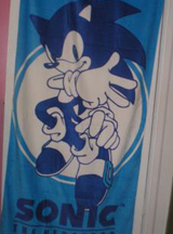 This is a large bath or beach towel. The whole thing is done in several different shades of blue, for an interesting look. The background is the 'spin' design that was used in SA1, however the Sonic art is more modern and dynamic than most from that time. The logo is the new-style one, and the design is nice and big making it a cool & fairly creative towel to collect. It measures 29.5 x 59 inches, so it is really large. It was made by GE Entertainment, and appeared in 2009/2010Fall/winter. You can get it online or at FYE stores in the USA, which appear in certain malls.