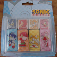 This is a selection of magnets. You can use them for the fridge or on note-boards to add a Sonic touch to the kitchen! They're all quite Sonic Adventure 1 style, with the colored checkering in the background, and the use of the Sega stock art from this time. You get all the magnets as a set, and they are produced by GE Entertainment. These should be available at online retail and FYE stores in 2010.