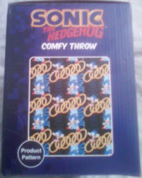 This is a "Comfy Throw". It proclaims 'the blanket with sleeves', as it is trying to be like the name brand "Snuggy" blanket. It is made of the same fleecy material as the actual blanket (seen above, with Labrynth style background) however, it won't lay flat, as it has been made with sleeves. This type of item is considered to be tacky, for some reason. The pattern here is QUITE similar to the 'ladies wallet', with checker stripe, old-style font, and classic Sonic. They've added angled rings for interest. This can be found at FYE stores for about $19.99 in winter 2010.