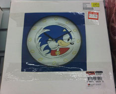This square analog clock looks classic, but isn't. It features curled/spinning Sonic in the center (pretty appropriate!) black hands, & a ring where each number would be on the face. It was auctioned off by Sega itself in 2011 to raise money to give to the Red Cross to aid victims of the earthquake & tsunami that hit Japan earlier in the year. Clock also appears at GKWorld.com & FYE retail stores in 2011. It should be around 8 dollars.