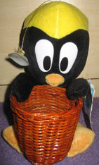 Well here's a nice close-up of the black bird or penguin. Here, you can see the detail of the basket, and get a good look at the face. It's a cute detail that the wings or flippers are curling over the top!