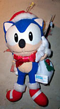 This is such a funny Christmas doll! Look at the big, silly, smily mouth they gave it. It just looks so cute and happy! Notice also that it is not the same as the one in the above picture. The hat is on streight instead of at an angle, and this has a sparkly edge bow around the neck instead of a furry Santa Clause collar. They have switched Sonic's normal socks for fuzzy winter ones. The second picture is a fan-photo, and is somewhat sharper for the details.