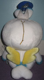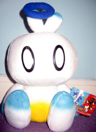 Now in the gallary is a close up of the Hero Chao plush! Isn't it wonderful? It's a real bummer that it is so rare. Here, you can see the shiny softness of the fuzzy fabric. The back view gives an un-seen before look at the tail and little wings! It even has a blue tip before the dove-like tail. The 'halo' is held up by a clear plastic cone. The strange white eyes are also solid plastic. With such great accuracy and quality materials this is a great plush to add to your collection!