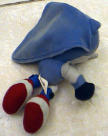 This is a rather bizzare item, isn't it? It's not quite mutant but then it's...not quite MetalSonic either. The 'spike' is actually a flat flap of floppy cloth. Why? Who knows. It has not been altered or destroyed in any way. It is however slightly faded and has some dirt. He is indeed an official Sega item, as the faded tag shows. It is obviously supposed to be viewed from slightly above as in the last photo. But they did detail him out, with small shoulder guards, wrist cuffs, and all 5 pointy felt fingers. The jet engine in the chest has sewn in vents as well. It isn't very large, perhaps only about 6 inches high.