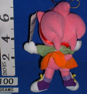 This is a Sonic CD era Amy Rose plush. As you can see, she's in her old outfit. The outfit for this relativly small doll (only 6 inches high) is quite detailed. With colored socks, accurate shoes, and even little yellow bows for the laces! Look at her skirt too, it has a hole in the back for her tail. The spikes are well formed and you can see her headband too. However, she's not without problems, as her nose is HUGE. They've chosen to go with a 'fur' for her 'bangs', and she has no fingers. Still, this is a very detailed older Amy Rose.