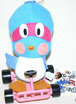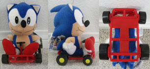 This is a "UFO Catcher/Claw Game" prize toy. It's a mini Sonic plush who is riding on a plastic go-kart and waving! The giant smile-mouth and mini car make this a rather charming addition to your collection...if you can find it. Since you actually had to WIN this as a prize, it isn't very common. Also on the set were Eggman and Flicky Bird.