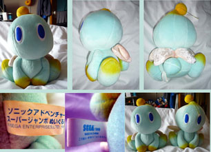 This Sonic Adventure Chao is one of the more sought-after plushes. It's large size (10 inches) and quality really put it over the top. As you can see, they've used big plastic for the eyes, and the wings are 3D and textured. The soft yellow on the tips makes it look just like in the game!