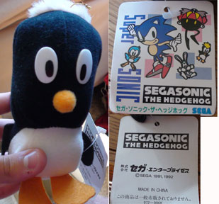 In the gallary, you can get a nice close look at the tiny penguin plush from the "Super Sonic" tag set. (Has nothing to do with Super Sonic, just has the word on the tag) The mini penguin is cute, with fluffy white topknot & plastic eyes. The tag still has that error gray mustache skipping eggman, & also shows the penguin with yellow instead of white feather-top. The Flicky & the bunny look about like their dolls did. The back of the tag has "Sega" on it in Japanese, with the copyright info.