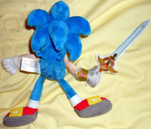 Jazwares released this Sonic & Black Knight themed plush in summer 2010. He's not much different from their 'improved' plush line, with the only real difference being the ears are likely to stand up better, and the gauntlet & sword have been added. Excalibur is a sticker over slightly flexible material. The gauntlet is somewhat shiny fabric. He's the same size as all their other plushes, at about 7 inches high. That stain you see on him is a factory error. It is a glue spill. As with everything you buy you should ALWAYS inspect it before you bring it home. As, in this case the stain is really where you don't want one on your pants.