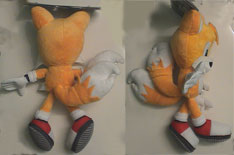 Though improved from the smalls, they still suffer from a few of Jazwares chronic plush problems. Look at how fat Sonic's arms are, & the body shape isn't even the same as their stock photo. His shoes are also small/mis-shapen. Tails has giant fat ankles for no real reason, and the face is far less cute than Classic tails. His tails are also flat, not due to under-stuffing, but construction. Sonic's expression is still not the best.
