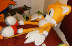 This is a giant size Kelly Toy Tails. He's 60 inches! That's a yard stick in the 2nd photo with him, not some small ruler. He has some differences from the above doll (no gray in ears, flat 'bangs', flatter hands, longer legs, larger eye-color areas) as well as a mistake (his nose is round, not a triangle) but he still looks quite nice, and cuter too with the appropriately sized eyes and center-smile. If you've got space in your house, this is a great giant plush to collect!
