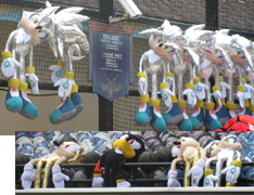 These are giant (almost person sized) plushes that are available to win at Busch Gardens amusement parks. This is at Williamsburg. They are Kelly Toy, as you'll notice the long legs, & shiny fabric. They're not as 'noodly' as previous ones, but they are withered /wilted, as noted in the bottom of the photo (Super Sonic) by understuffing. 1 try at the game was $5, so it's a risk! But you do win a doll with 1 basket.