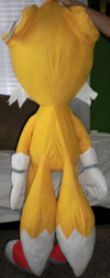 This Giant Tails is really big! Is this Kelly Toy's largest size? Here he is sitting on a normal-size couch, and then being held up...so it's likely about 54 inches high. You can see the tag in the ear. The back view shows he's a tad under-stuffed, but keep in mind the wrinkling is partially due to heavy weight...all giant dolls tend to be pretty heavy too. Notice his tails are sewn on slightly apart from eachother, where as most dolls have them sewn in touching eachother at the base.