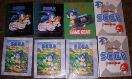 Sometimes, when you would buy a Genesis game, you'd get a little catalog with it. The 'Authentic Sega Gear' catalog is the point of interest here, as its entire front is covered in Sonic merchandise you could order. This came with games around the Sonic & Knuckles era, and pretty much all of its items are considered rare. The back had a big Game Gear page, with different screen shots to lots of games, while showing Sonic holding up a GameGear, and some accessories at the bottom. The catalog featured a button-down jean-type fabric shirt with embroidered rolling classic Sonic on the pocket 27.50, a Sonic & Knuckles themed analog watch with patterend band, and moving disk with S & K 14.99, the Dude With a Tude long white tee/night-shirt (seen on USA Classic, in the SonicGear collection) 14.99, low-crown-style S&K embroider logo cap 12.00, classic Sonic relaxed fit cap 12.00, sleeveless denim stone wash button down jacket with 4 pockets, Sonic & Knuckles logo & words 39.99, blue S & K "The Best" sweatshirt 26.99 white classic rolling Sonic (and logo) sweat shirt 26.50, Sonic BLUE 'em all away blue tee 14.99, 2 dudes with atti2udes Sonic & Knuckles long sleeve IR short sleeve tee 14 OR 15.99, Fun Second 2 None Sonic & Knuckles sihlouette black tee, 14.99. ALL of these were available youth small to adult XXL, so anyone could wear them. With all the items being relativly inexpensive, yet well made, and in all sizes Sega was really catering to the fans!