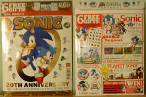 The 20th Anniversary issue of Games Master Magazine (in the UK) was a real big deal...for Sonic! It came with great free prizes (seen around on the UK pages of the site, like pins, stickers & etc) it also came inside a special slip-case (both sides seen at center, above) It features artwork from generations and around that is sonic artwork from 1991 to present. On the back of the slipcase there is info on what is inside the magazine and also there is a notice of a competition to win a holiday to the sonic themed room at alton towers resort.
