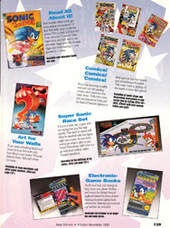 Here's Sega Visions' "Totally Sonic" section. You'll see a different issue on another page that has quite the similar layout, but with different merchanside. This section was recurring with the magazine. The left page has Sonic 'director' art again. (ignore Sega themed clapper) The hat can be seen on Accessories & all 3 shirts are on Vintage clothing. The right page has one of the Sonic paperbacks (on Books) a selection of the early Archie Comics the somewhat uncommon Sonic 2 poster, the Sonic/Tails "themed" figure 8 race car track & the bottom item is an interactive electronic story book w/rub away marker. It has batteries, lights up & does games. It was also released in Europe in other languages.