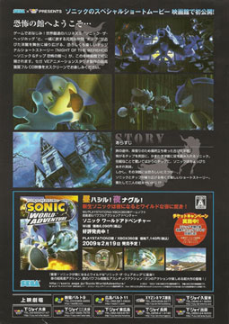 This is a 2 sided flyer for Night of the Werehog, the CG promo mini movie used to promote Sonic Unleashed. In Japan, it was shown in 9 theaters and had it's own poster. This item is called an Eiga Chirashi , and it's like a smaller version of the poster, but with additional info on the back. They show up in theater lobbies to promote current/future films. It's about the size of an 8.5 x 11 , but since it's only a flyer many are thrown out, making any remaining highly collectible. The text on the front translates to "Sonic & Chip's house of horror".
