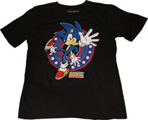 Here are 3 different shirts found in Canada Wal Marts. You'll easily recognize the first one with rectangle character close-up portraits as a variant of the USA version of this same design. The difference here is, that the tee is navy blue. The 2nd is a long sleeve shirt & cap combo item. The shirt has a nice new design, with Sonic in front of a big red star-bumper like shape. The cap (interestingly enough) has the SonicTeam Sonic face all-blue logo embroidered on. There are rows of little yellow & red stars beside it. The third shirt has backward leap/tumbling Sonic in front of a ring of stars that has the "SA" type swirl in the middle. Each ones is a boys/teens size.