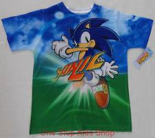 Is this another of those lycra material tees that was so popular in the UK area back when Sonic X was new? The colors used here make it look like it could be. The bottom half is green, while the top has a mottled blue to look like clouds. Sonic is in the 'jumping twist' pose (Which did not exist at the start of Sonic X, as a stock art, so this is a newer tee) with his name in a different orange font. It's not as busy as other shirts, & looks pretty cool. Do you know where this can be found or what it is made out of?