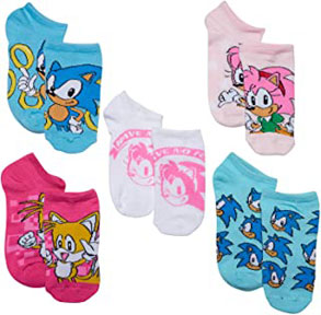 The cover photo is the boys 5 pack. These are 'no show' socks, meaning they're just anklets. They're all modern, with the deigns sewn in/so they don't wear off. You get standing hand/hip Sonic with red and black, thumbs up in a ring Sonic with gray and blue, a scattering of forward & 3/4 Sonic faces with red & gray, gold rings on blue/red & a white outline Sonic on blue with red.