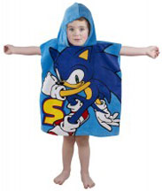What exactly are these? It's a poncho cut / style item, made with sort of terrycloth towel type fabric. It has a hood, so is it some type of bath robe? Are there sleeve holes or are the sides open? Is it for the beach to protect from the sun? The left comes from Asda in 2013, but what exactly are you supposed to do with it? It's 1 size fits all, & is about 5 pounds. The right is for tiny kid sizes only and is 9.99 pound at characterworld.uk.com (why is the smaller one more money?) The Sonic graphic here is nice, with it so large that he runs off all 4 sides of the item. This is a rather unusual Sonic item.