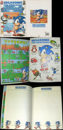 First, the front & back covers (top) are full color. The front has a Green Hill scene with running Eggman art (going down a hill) and a scattering of little animals & badnik robots including Ball Hog (top left) who is rarely seen. The back has hand on hip waving Sonic in a smaller scene. The two cover interiors are also full of art. One has a green hill & cave scene (with random enemies who don't appear there) while the other has art for Sonic and some badnik robots, giving the name for each item in Japanese. The inside has all nice lined paper, with logos at the top. Each left page has 'looking out' Sonic, while each right page has Eggman standing in the bottom corner.