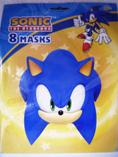 Is a mask a party supply? What exactly do you do with it at a party? A flat paper mask doesn't really fit into any other category on the site though, and it IS sold at a party supply store so...here it goes. The mask features a nice realistic render of Sonic's foreward-facing face, though the breathing holes (partially in his eyes...) make it look somewhat odd. At right is what the masks look like in the package, it's a simple starry background, with an un-hole-filled version of the mask graphic. These are about 8 inches wide by 9 high. Discovered by SonicBoy19, right photo by Berzerker This is a Party City Item AND it is ALSO available in the UK. UK version seems identical.