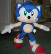 This is the "Posable Sonic Plush" by Sega Toys. As you can see here, he's actually standing and 'walking' without any support! It is jointed inside to allow you to pose him however you want, and he'll stay that way. As you can see he does suffer a bit from 'giant mega finger', but that's pretty much the only thing. The head, foot and body shape are all good, as well as the eyes and expression. This is some time post-SA1 (green eyes), and looks quite good! Being able to really stand and pose a plush adds to the fun and display ability, especially because it is well designed.