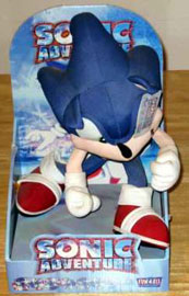 Around the time of Sonic Adventure 1, several companies looked to capitalize on Sonic's new look. This doll however, was never common. Meant to be sold on the shelf (not in a pile, like usual plushes) it comes in this cardboard backing/seat. Notice the logo shaped SA1 tag which distinguishes it from other dolls. This was made by Fun4All around 2000. It should be about 12 inches high. This is also a talking plush, but what does it say? Write in if you know! The face is OK, though the bottom part is a bit big/puffy looking. The feet are well shaped, as are the hands, but they're small. The eyes & mouth look like embroidery. It's not a bad plush, especially given the era it was made & how companies handled the design change.