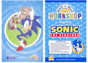 Notice the ears, espeically for Sonic: they're actually 3D triangles, not the usual flat flap sewn on so they'll stay standing. It's a good touch. Makes him come across more like 'teddy Sonic' which is actually pretty logical for these guys. Tails is more of an accessory, as this plush is a lot smaller & simpler. He has mitten hands with no fingers, & tiny tails. The choice to do "front smile" for him is interesting & his expression looks good enough. The card has exclusive art on the front from the Japanese "Sonic Channel" artists. The back has a facts-sheet with facts like "Tails' name is a pun" and other things you've likely already heard. The symbol on their palm is the BAB logo. Sonic's branding is under his foot in the same way as the Tails has it.