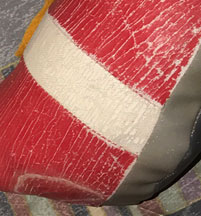 At left, you can see a fan fix for the problem. The coating was scraped off & red fabric paint was used to re-color the now all-white shoes. Since it wasn't 'puffy paint', but rather a matte non-plastic based paint, the doll shouldn't have the same problem to re-occur in the future.