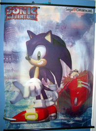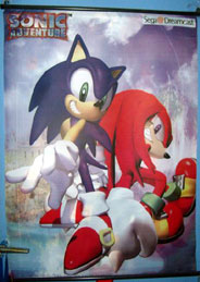 Sonic Adventure 1 Wall Scrolls. These are large 28.5 x 40 inches pieces of cloth. It has 2 plastic bars to hold it streight. When Sonic Adventure 1 was released, there were 4 or 5 of these made, each equal in size and quality. The first is in SonicGear's personal collection! You can see the Dreamcast logo in the corner, proving it is official. Sonic Is there another scroll? They are highly reccommended, due to great graphics and awesome quality! They have become uncommon.