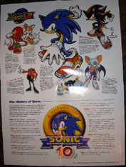 This reversable poster was included with an issue of Dreamcast Magazine. The front has Sonic & Shadow with the logo and some of the vehicles (Eggman & Tails) along with a contest announcement and the 10th Anniv. ring logo. The back features breif character profiles and a "history of Sonic" paragraph set at the bottom which should be similar to that found in the 10th Anniv. bonus box item that was given away at about the same time.