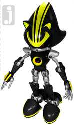 The left one is 'paint-less' with an exposed metal finish and rivet/seam details. It is meant to resemble (but doesn't really) Sonic 2's "Silver Metal Sonic". Remember, he was the very round-headed one with the table-saw blade installed in the back of it. The right is a new yellow and black (with a bit of racing stripe motif) color scheme. It is meant to look like Metal Sonic 3.0 (Mach 3.0) from Sonic Rivals 2 (for the PSP) however, there are several paint details & body details that don't match the game. They have admitted that Sega won't let them produce actual toys of these in this format, so they will always remain in prototypes. (Likely because the lack of real resemblance to the in-game sprites--they'd have to make new figures to do them) Additional info by Aquaslash