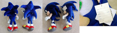This is an unusual type of prototype...the marked prototype. With the tag at the right, you can see that the right-side doll was something sent to Sega to approve the design of, before the doll went into production. But who made these? Yes, it IS the nefarious "Toy Network"! Apparently, they were good at plushes at some point??