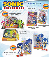 At right is a page that says "New" all over it, though only 1 item is actually new. It's the Shadow/Rouge comic pack in the upper corner. The Rouge is just art, and actually the only thing on the page that's not a real photo. Since everything else is actually pretty old by now, it seems strange. The Super Hedgehogs Pack looks to have corrected emerald colors.