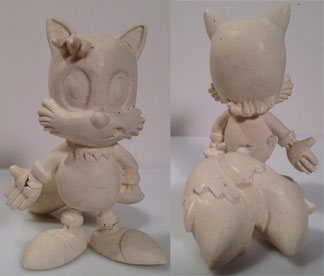It is probably the prototype for their early Sonic 2 era PVCs. Notice how they're not really that accurate, even after Sonic 2 showed the back of the characters. Tails has a full fringe on the back of his head, about no legs at all, is super fat/big body, and is not particularly cute. (The Tails sprite in Sonic 2 was always quite cute) Sonic also has very small...eye...really large single finger & bigbody. Because the final actually produced PVC or display figure may be different from these sculpts, it's hard to tell what these are prototypes of. Can you take a guess? Write in if a figure looks familiar.