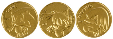 They're likely to be by Tomy, who showed many other items there. (Photo is close so you can't tell if it's their booth) These figures each come with a coin that's silver on one side & yellowish/goldtone on the other. The coins all feature nice looking neoclassic art corresponding to the character it comes with. Flying Tails, pointing Sonic, & arms crossed Knuckles.