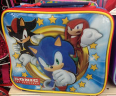Here are 2 soft-sides lunch box / lunch carriers. The left has Sonic & Shadow with 2 different backgrounds (notice how Shadow's side is on fire...) The right has Sonic, Knuckles and Shadow with a big gold CG ring, stars & red logo. That background is all clouds. Each one is made of plastic with hot/cold retaining stuff in the outer walls. The right bag is from Toys R us and is usuall 7.99 but you can get it for free in fall 2013 if you buy a backpack at TRU. Free bag info by CrystalSonicFan