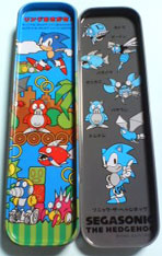Here's a fun pencil tin for your collection, complete with real screen shot-added art. Finger waving Sonic stands at one end while a drawn in Eggman (in a footed Egg-o-Matic) stands at the other. A real screen shot of the Green Hill Zone (complete with Sonic sprite!) faces off against Eggman. The interior has a full-color bottom with well done Sonic, happy Crabmeat, Moto-bug and a hidden chameleon in the Green Hill Zone. The top has a duo-tone guide to badnik robot names.