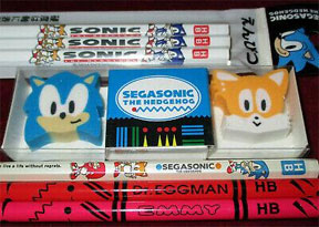 The left photo shows items from other school supply packs, like the Sonic & Tails white pencils, the STK pearly finish white pencil (came in a pack too, seen elsewhere on gear) and the HB red pencils which had character names on them. There's a Dr. Eggman, and then...."Emmy"? That's right, in the VERY early days you could get Amy Rose spelled as Emmy Rose because the Japanese letter that starts her name just goes "Eeh", (kind of) and there isn't a letter for "Aaayy" to make it specific when converting it into English letters. (Why not mess up Eggman too then? He couldn't, because he's literally 2 pre-existing words & not just a regular human name.)