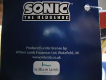 This is a pair of kids wellington boots. They're an all-rubber rain boot with cool Sonic theme. It uses new 2011 Sonic art nice & big on the sides, with the modern logo. The tag has the license info & that it was made by William Lamb Footwear. You can get these in fall 2011 at Sainsbury's for about 9 pounds, however, do watch out because they're all small. Look at the pair sitting on the hand, that's not likely to fit anyone which is too bad.
