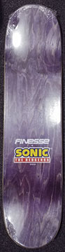 Finesse Skateboard supplies has crafted 2 cool Sonic themed decks. One has modern Sonic sliding forward to catch 3 rings, and the other has Metal Sonic hovering. Each one uses a 'paint splat' type background with white. Sonic's splat is black & Metal's is light blue. Both have the modern logo at the top, as well as the Finesse logo. The top of the board has a dark wood-grain texture, and the Sonic & Finesse logo repeated.
