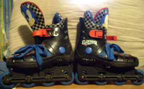An interesting counterpart to the Eggman & Tails skates, here are Sonic Rollerblades! These aren't quite as decorated as the skates, but they're still quite 'Sonic'. The tongues have the foreward facing Sonic art on a checkered background, and the sides have the Sonic logo. The theme is a simple black, blue and red.