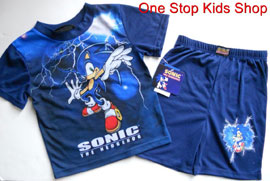 Here are 2 fun pajama sets for the summer! These cool sets have a pair of shorts & short sleeve shirt. The left has a dark blue theme, with line art on black background & crouching Sonic. The shorts use a scattering of both the 'shirt Sonics' for its design, along with line art. To the right is a lightening themed set where the shirt has Sonic 'surfing position' (though he's not on anything) in front of a big flash of lightening. The shorts show a different pose on a lightening cloud, & use the logo on the waistband. Where can you buy these?