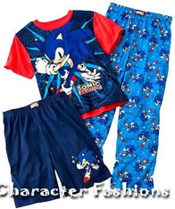 What's going on here? The first set has a red theme, with red background pants that have Sonic kicking through starburst shapes, as well as some logos. The right side set has 3 pieces, a pants, a shorts with Sonic graphic on one leg, and the same shirt as the first set. It's likely the same company in the case of all 3 of these PJ sets but who's making them, and where are they available? The red set is confirmed at WalMart, so the other could be as well. The sets keep on popping up on ebay at high prices, but they've got to be in stores somewhere. Found in winter 2012. The red set is 12.99 at WalMart.