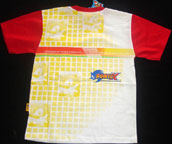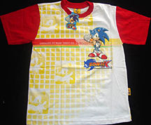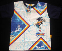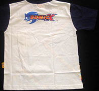Another decal gets applied with this shirt. It's the same "puffy-sticker" type solid plastice piece set on as an applique of sorts. (the logo is not a part of it) This has a fading grid of light blue (or yellow) squares with various Arm-Cross-Point Sonic X stock art portraits scattered among them. On the fading stripe is the usual "Rose Video" line and copyright information. Blue or red accents top off the design.