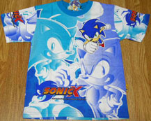 This shirt is quite shockingly green! First, there's 80s style hot green in the front tone for Hand on Hip Sonic, then they really crank it up by adding in yellow so that the (reflected) image in the background gets even brighter. It doesn't glow in the dark, but it is likely as close as you can get to it. The sleeves have pieces of the same design, as well as 2 Sonic X logos. For good measure, they threw another onto the bottom front corner, though it clashes badly with the green. Sonic is just a print this time, near the top.