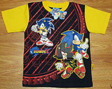 This wheel-like design/background shirt could be found in winter 2009. Available in 2 styles seen here, and mostly in kids' sizes, it's by the die-cut tag company again. This shirt uses plastic-coated Sonic, along with some dynamic new Sonic X art for Sonic & Shadow. The cog/wheel like design adds interest to the background. With not over-used art, this shirt is cool.